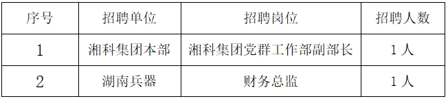 根据湘科集团经营发展需要,面向社会公开招聘党群工作部副部长和所属湖南兵器财务总监,现将有关事项公告如下: