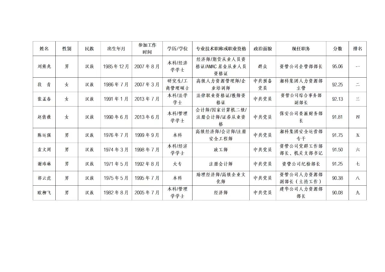 根据湖南湘科资产经营有限公司本部中层正职管理人员岗位半结构化面试结果,经资管公司党委研究,按照竞聘岗位职数1:1.5的入围比例,现将入围人员名单公示如下: